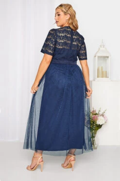 YOURS LONDON Curve Navy Blue Lace Puff Sleeve Pleated Maxi Dress