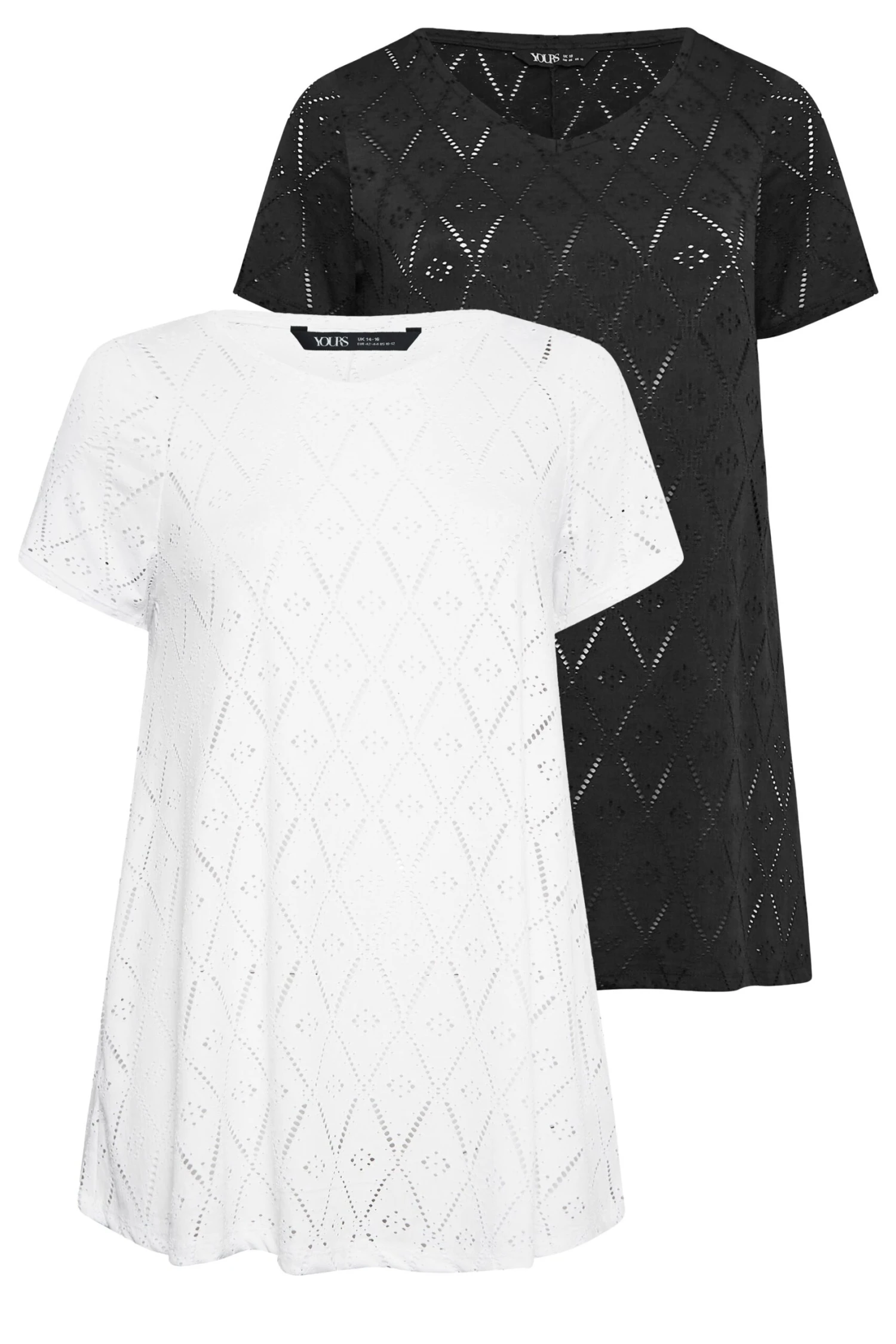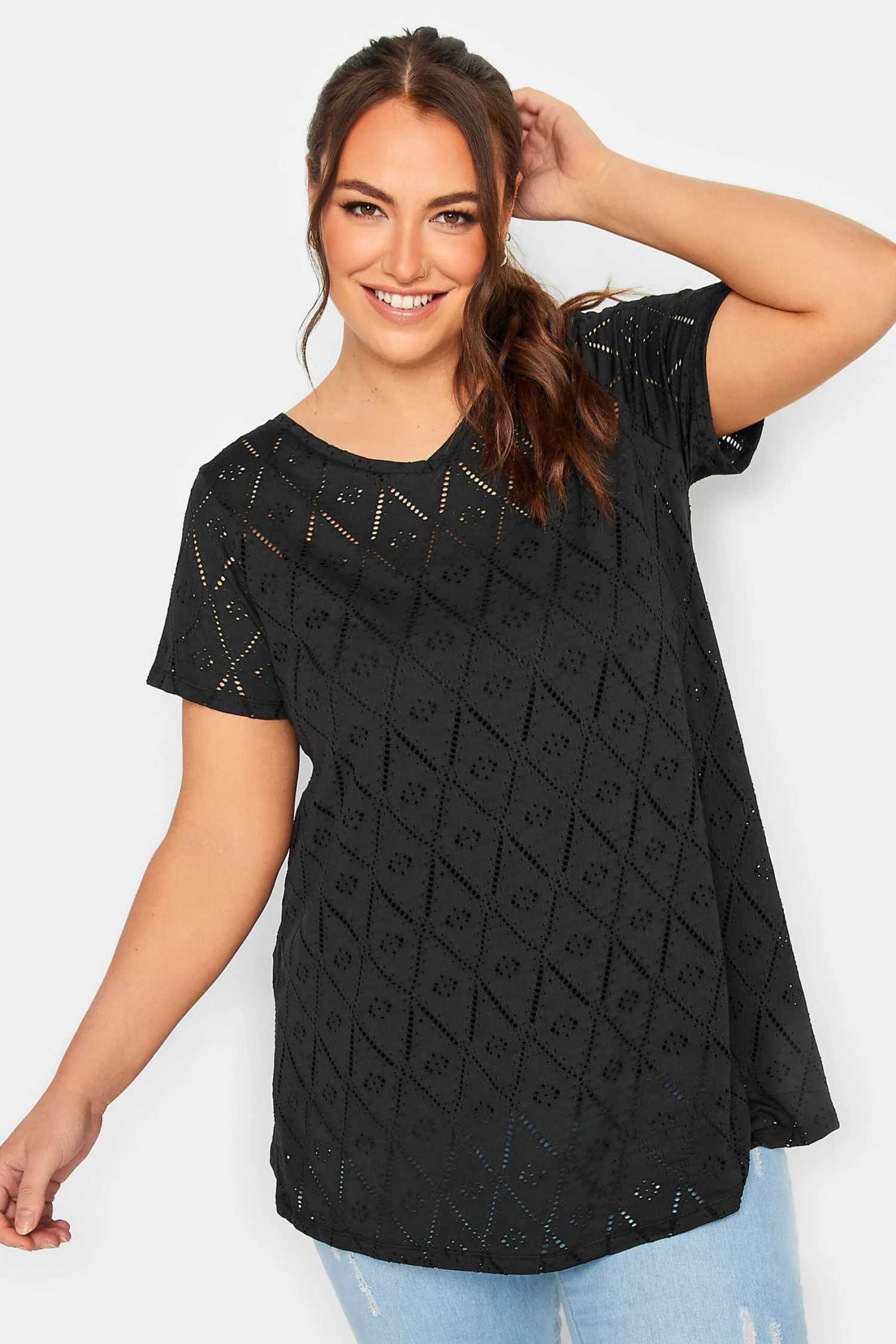 These new-in swing tops were made for dress down days. Made from a comfortable jersey fabric, they feature broderie anglaise detail with short sleeves and a v-neckline. Complete the look with jeans and a trainers for easy off-duty appeal.
