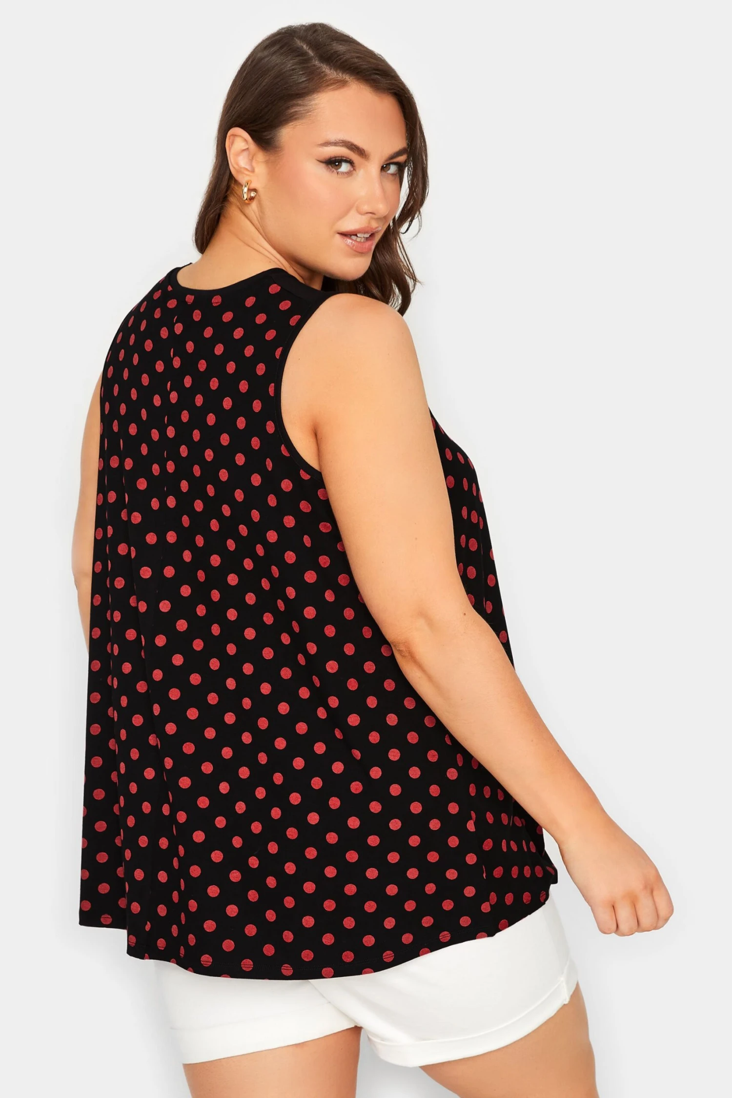 This new-in vest top is a must-have addition to your wardrobe. Made from a stretch jersey fabric, it features a scoop neckline in a sleeveless design with a polka dot print front, complete with a pleat front detail. Team with denim shorts for a daytime summer look.