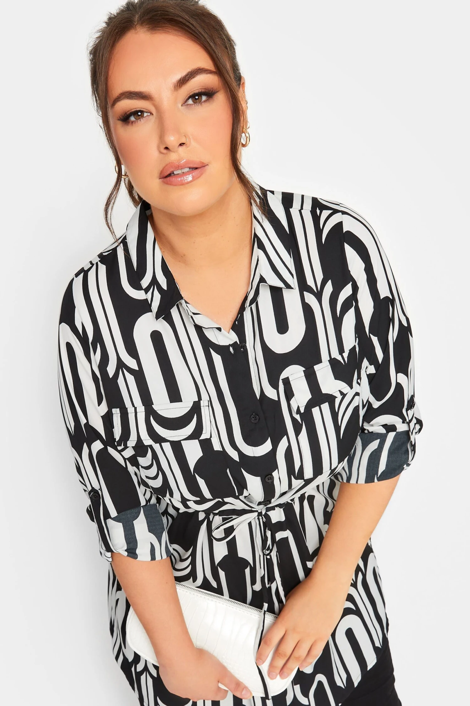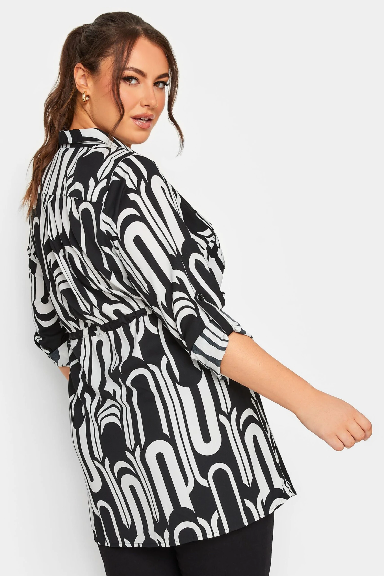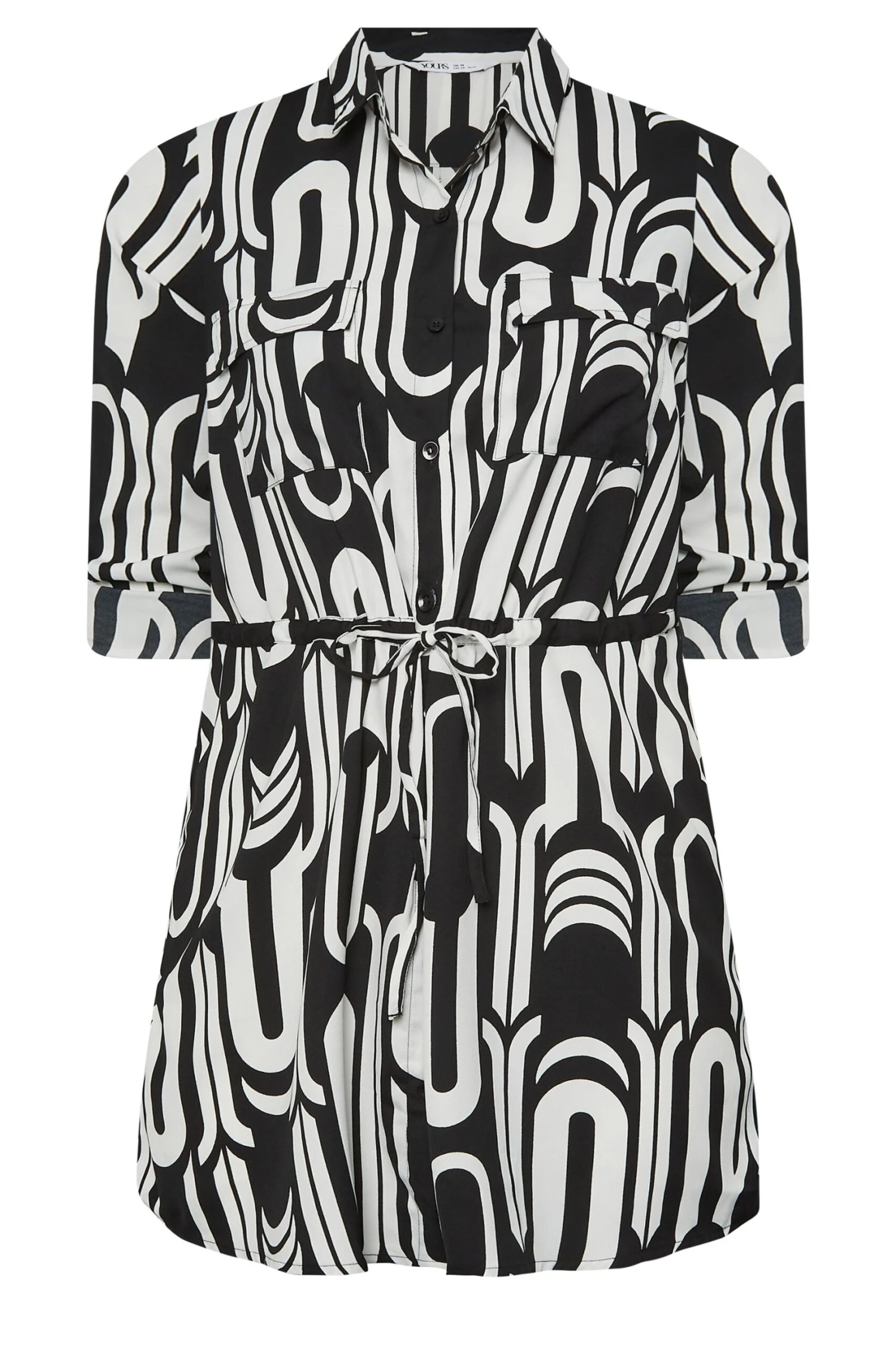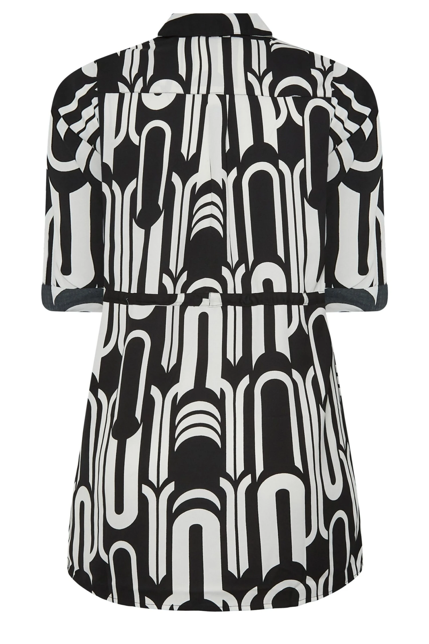 Stay on trend this summer with this new-in utility tunic shirt. Designed in a comfortable woven fabric, it features a classic collar, button-through fastenings and two chest pockets, complete with a drawstring tie waist in a geometric print. Pair with jeans and heels for a smart casual look.
