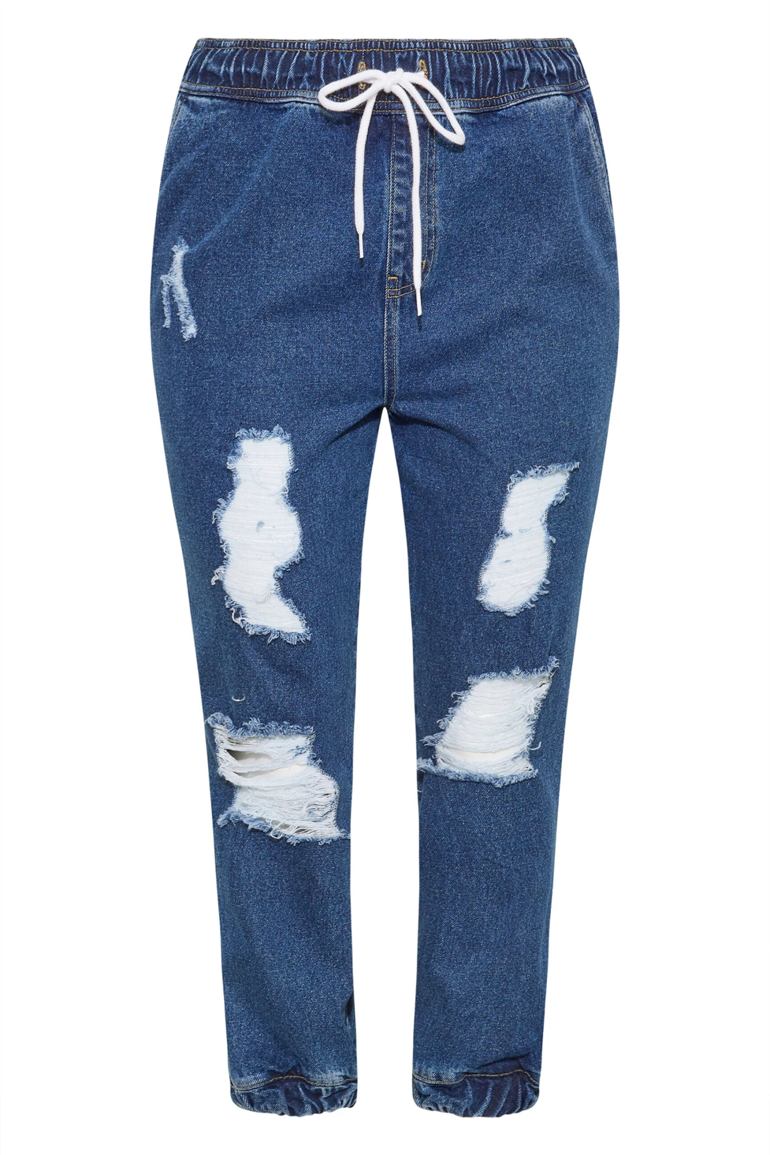 Where comfort meets style, these plus size jeans have it all. Made in a comfortable denim, they feature a jogger style with a flattering elasticated waistband and adjustable drawstring, complete with ripped details and cuffed hems. Pair with a t-shirt and trainers for ease every day.
