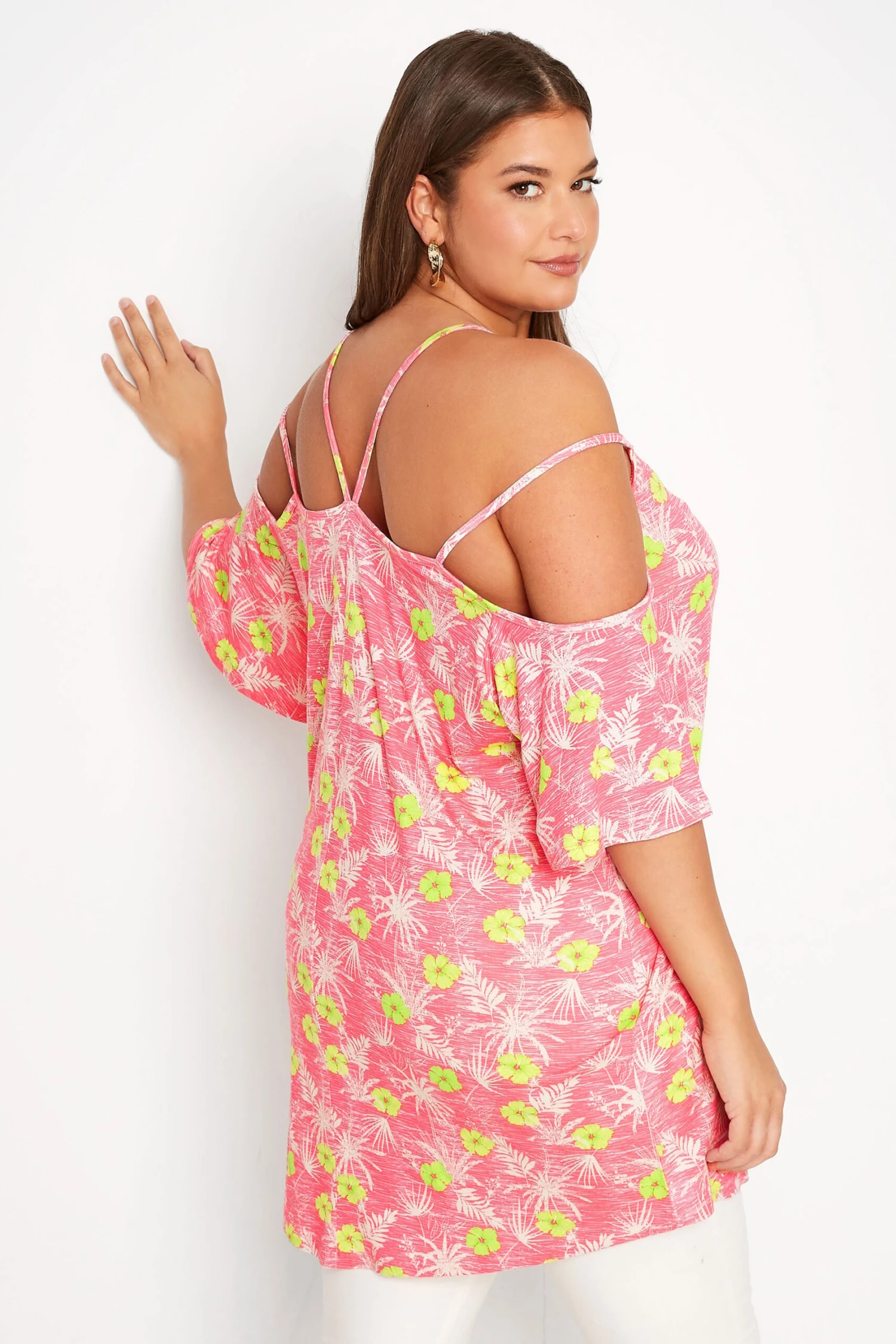 Get ready for summer with this plus size cold shoulder top. Made from a comfortable jersey fabric, it features short flared sleeves, a v-neckline and an all-over floral print. Pair with jeans and sandals for a casual yet stylish outfit.