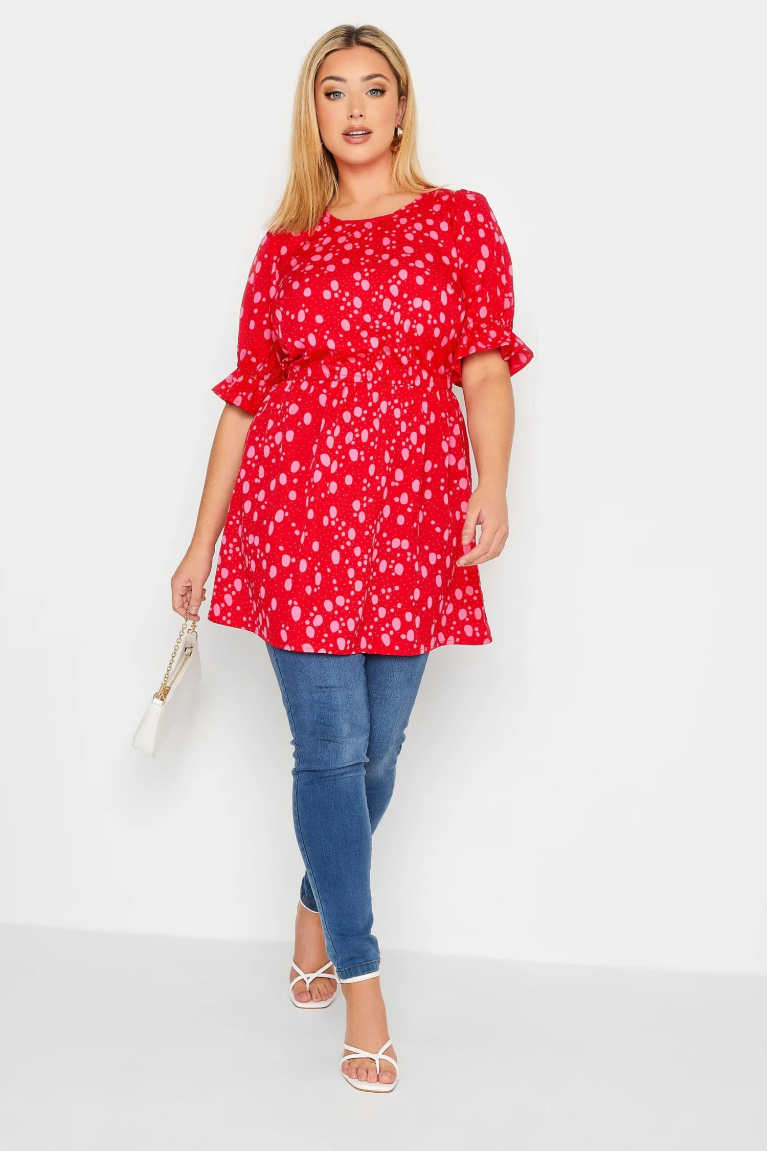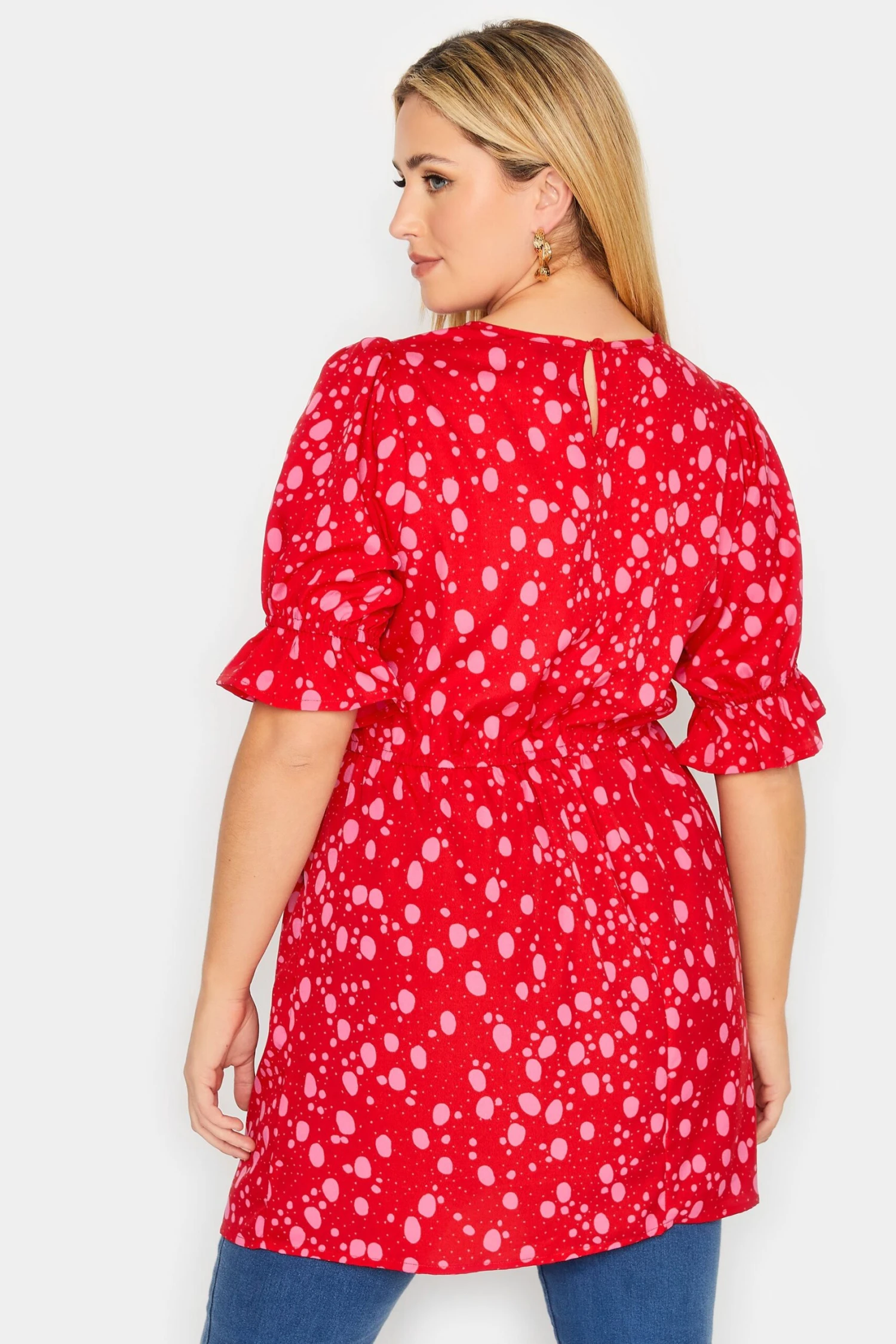 Make some room in your wardrobe for this new-in blouse. Made from a comfortable woven fabric, it features a scoop neckline, short puff sleeves, and an elasticated waistband, complete in a polka dot print. Simply style with jeans and heels to finish the look.