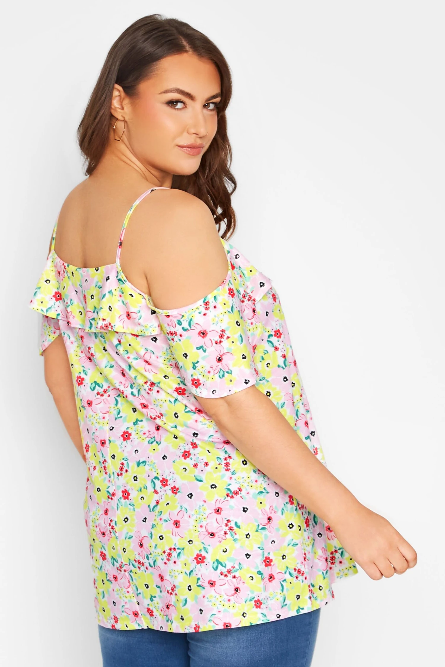 Update your new season wardrobe with this top! Made from a soft jersey fabric, this plus size top features a cold shoulder design with short sleeves and frill details. Style with denim and sandals for breezy, cool vibes.