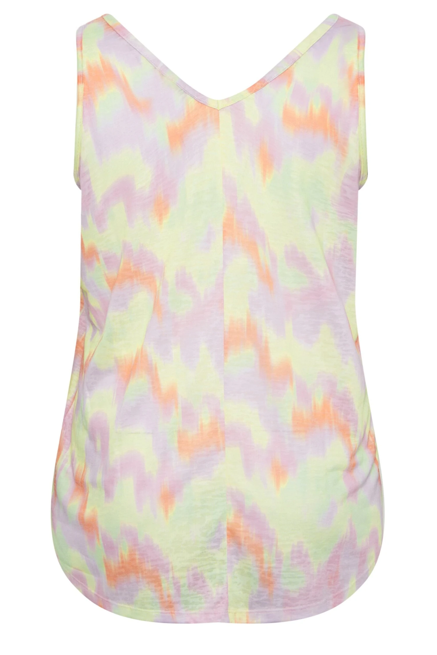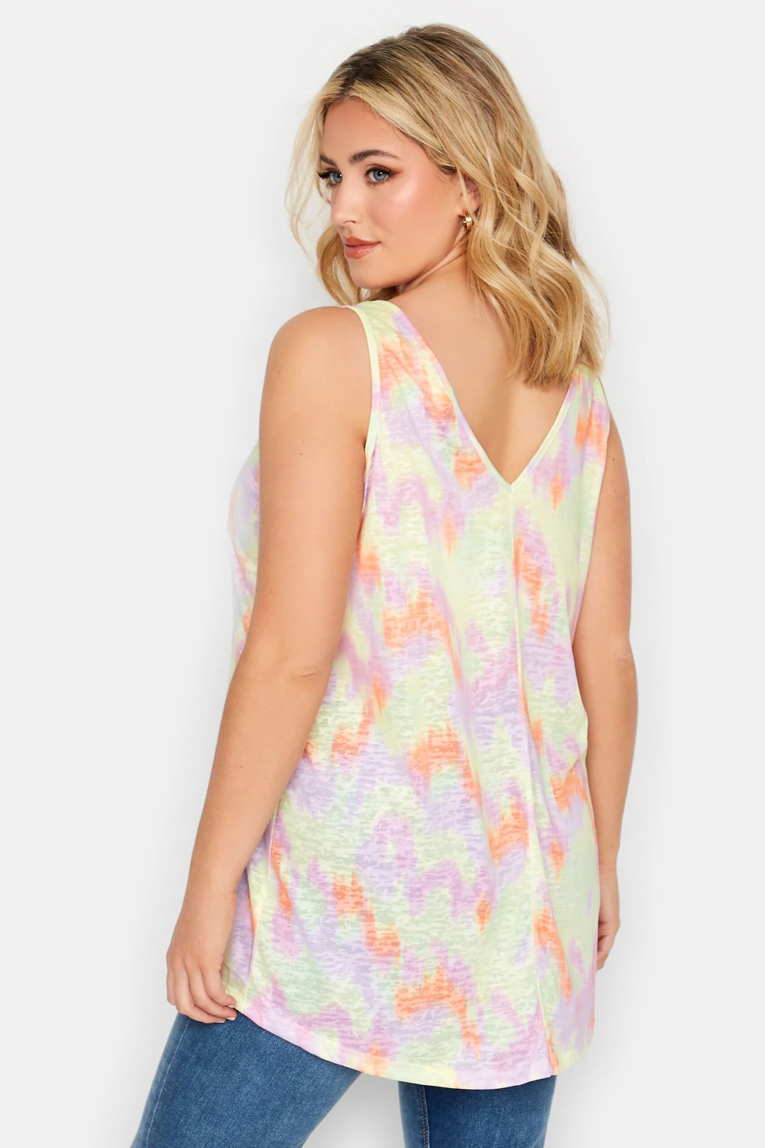 Welcome in the warmer weather with this new-in vest top. In a stretch jersey fabric, it features a v-neckline in a sleeveless design with a pastel burnout print. Pair with denim shorts and sandals to spend the day enjoying the sun.