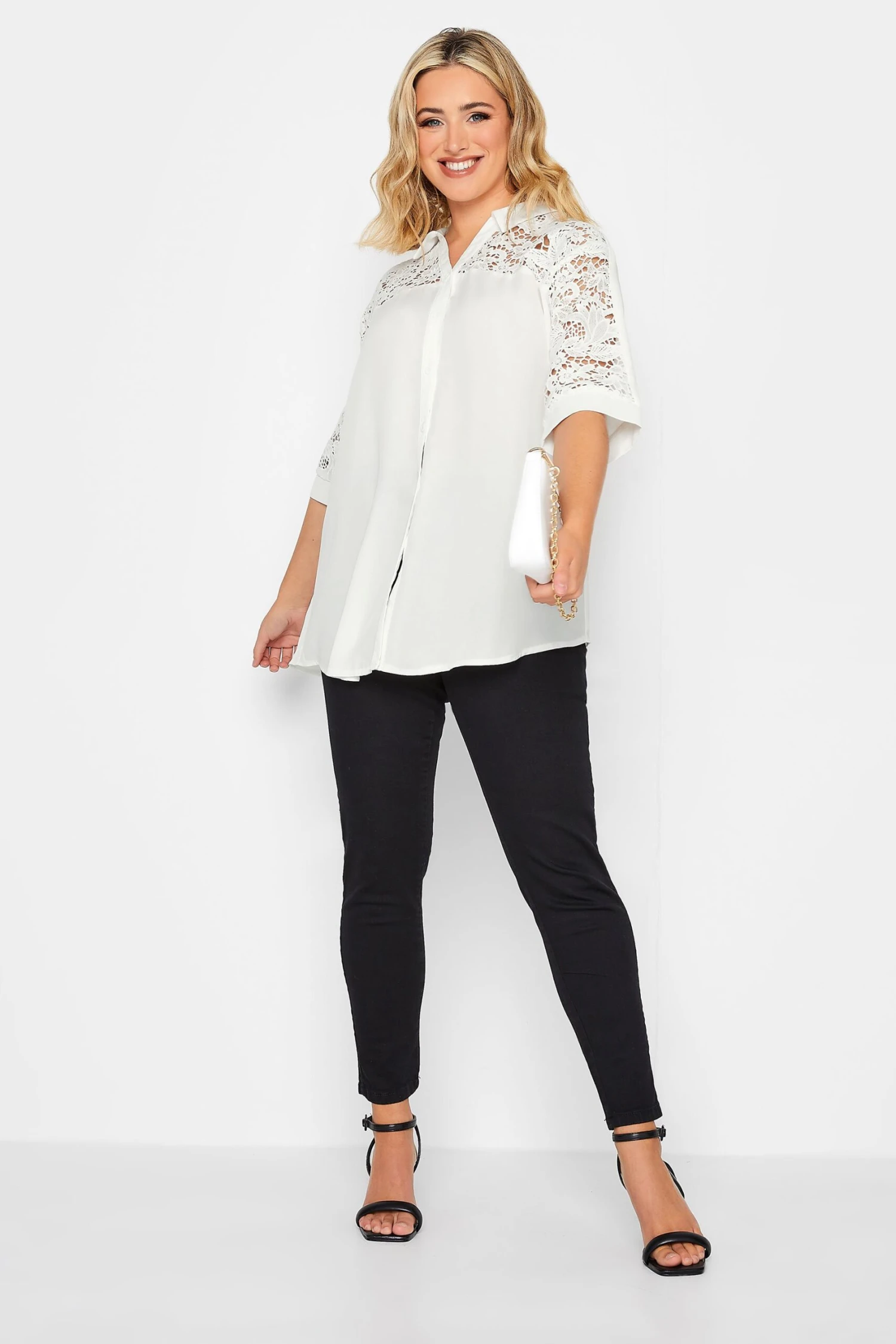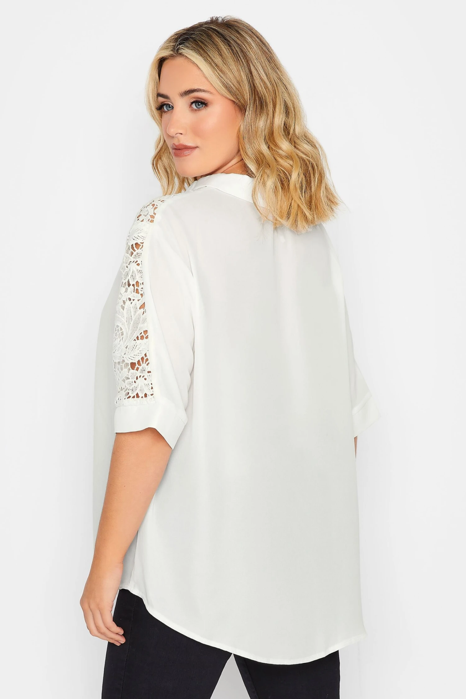 Elevate your wardrobe with this white lace insert shirt from Yours London. It features 3/4 length sleeves with a classic collar and button through fastenings. Pair with your favourite jeans and heels for a smart-casual outfit.