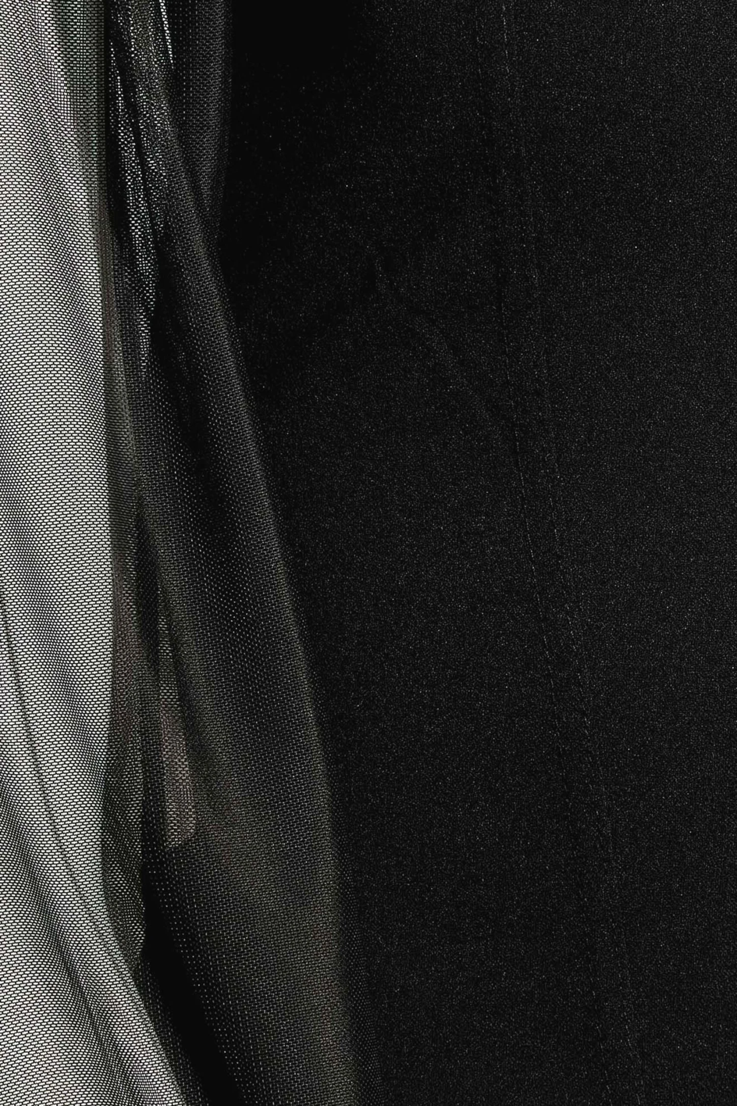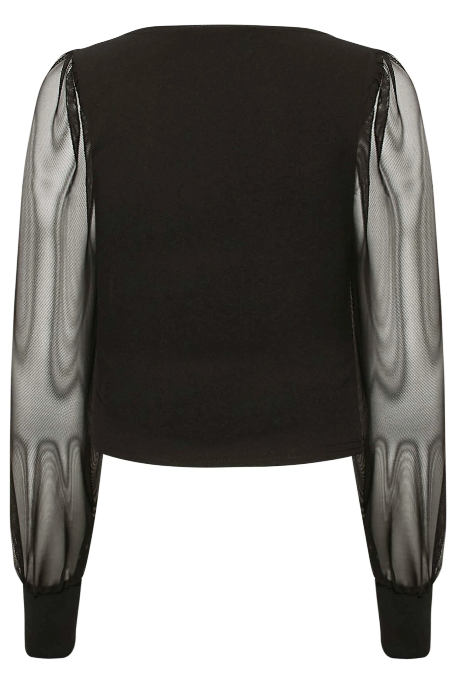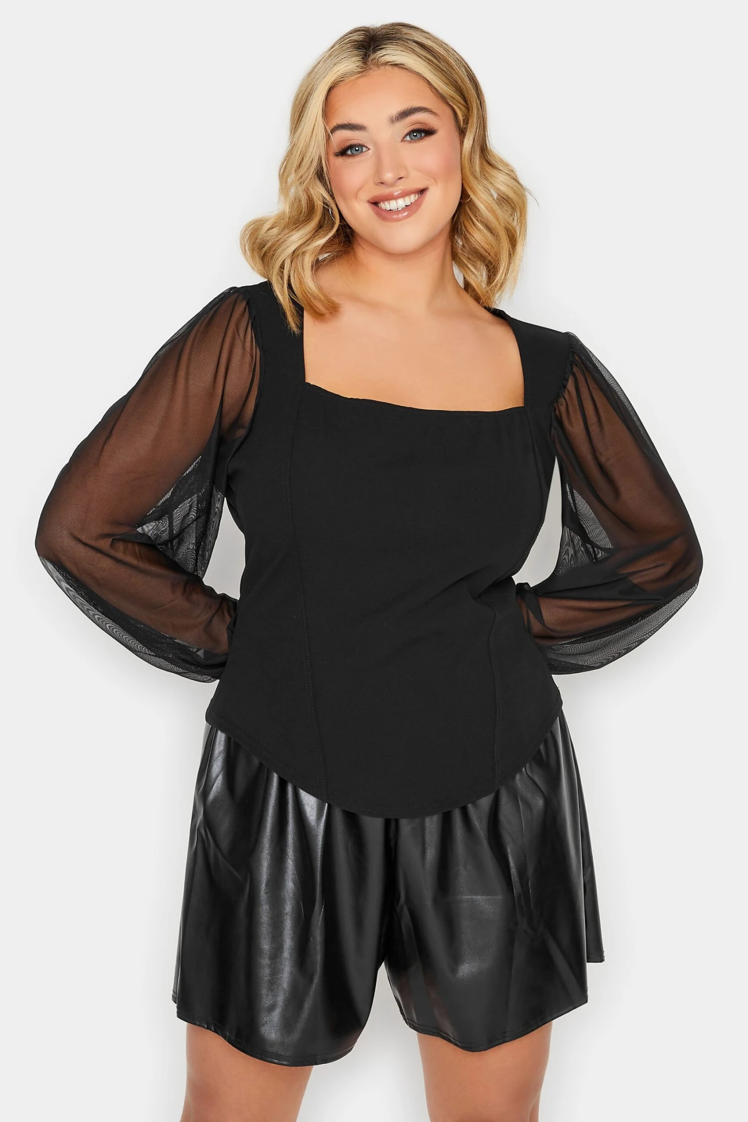 This must-have corset top was made for the weekend. Comfortable in scuba fabric, it features long mesh sleeves and a square neckline in a corset style. Elevate your evening look with leather leggings and heels.